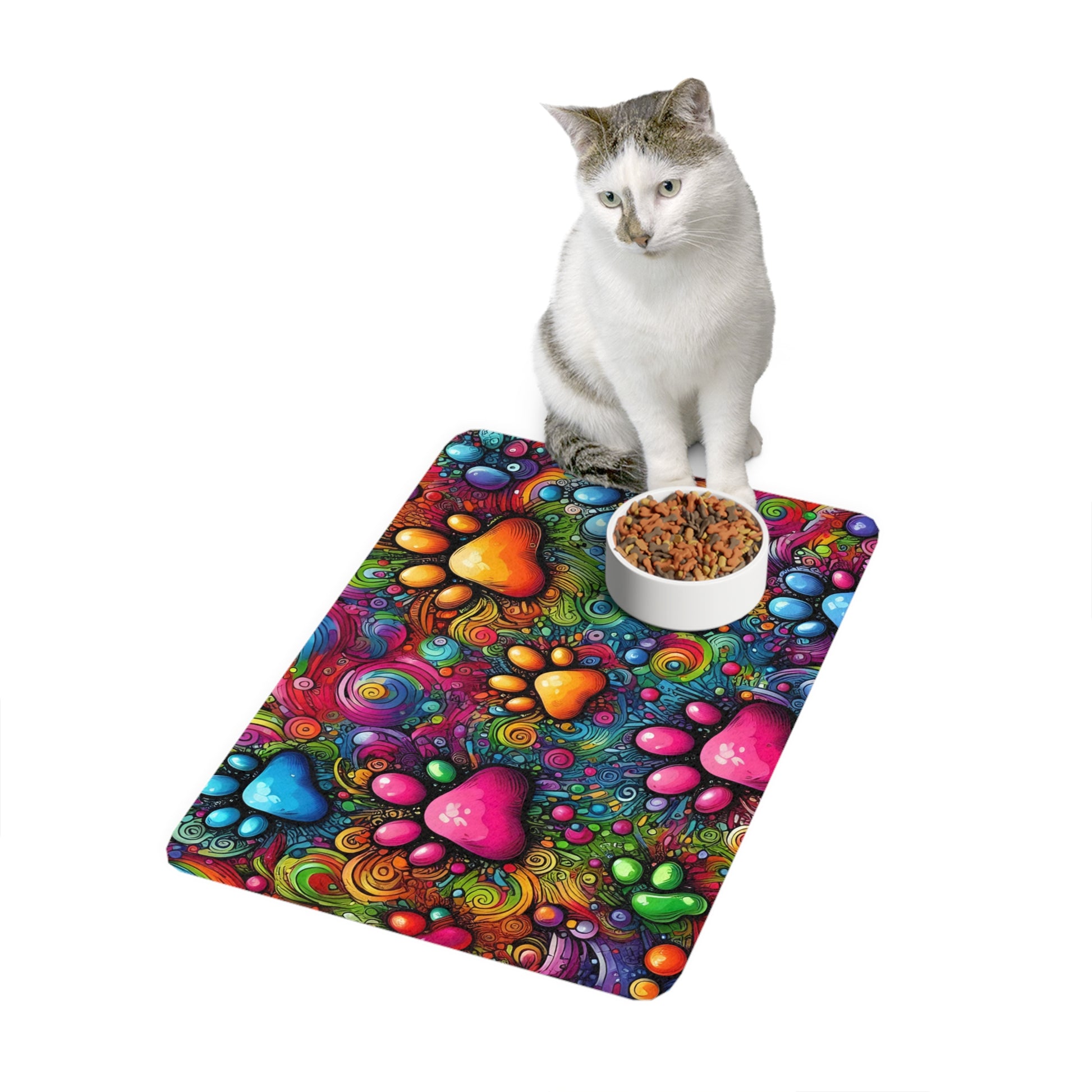 Colorful Paw Print Pet Food Mat — Non-Slip 12x18 Feeding Mat