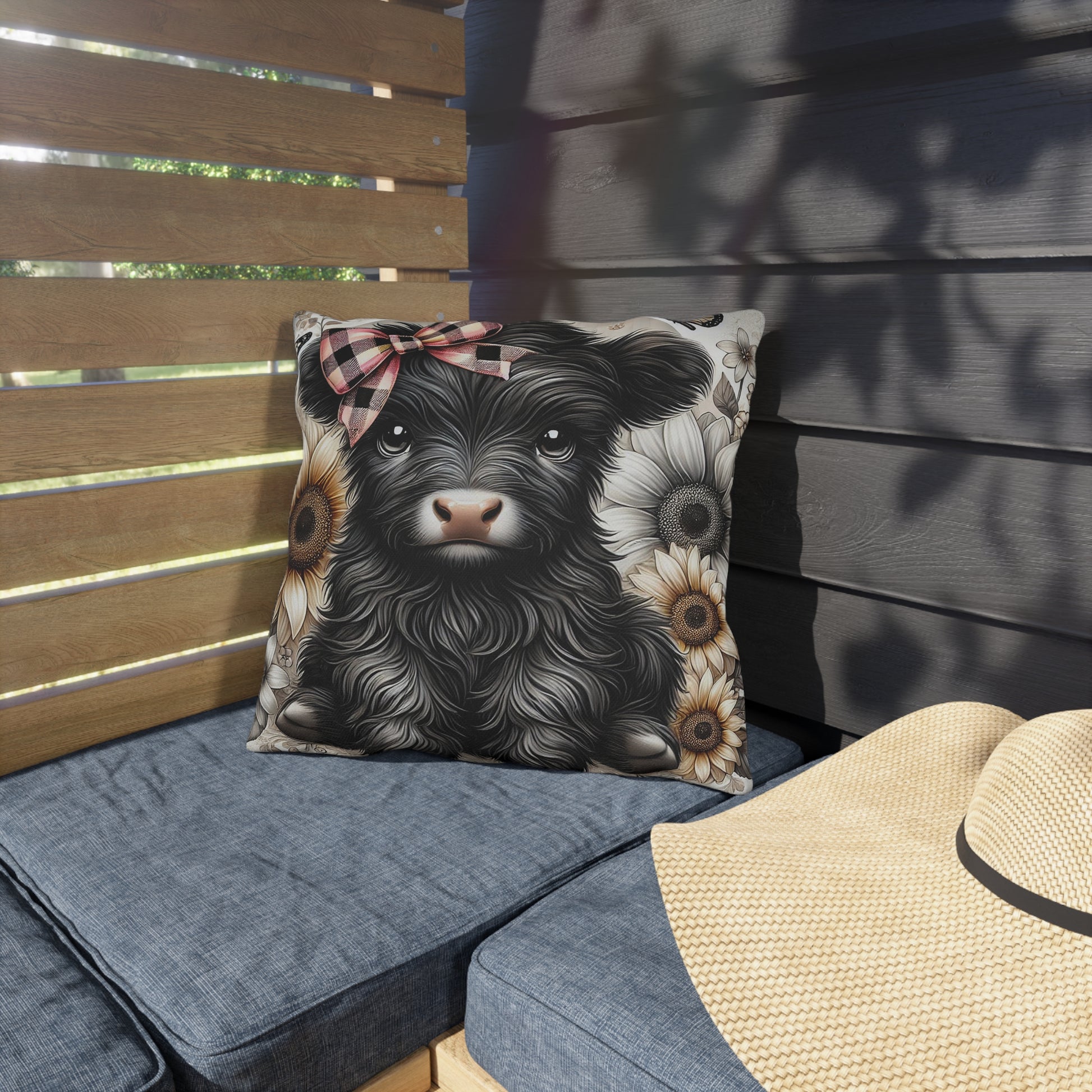 Highland Cow Outdoor Pillow — Cute Cow with Plaid Bow & Sunflowers