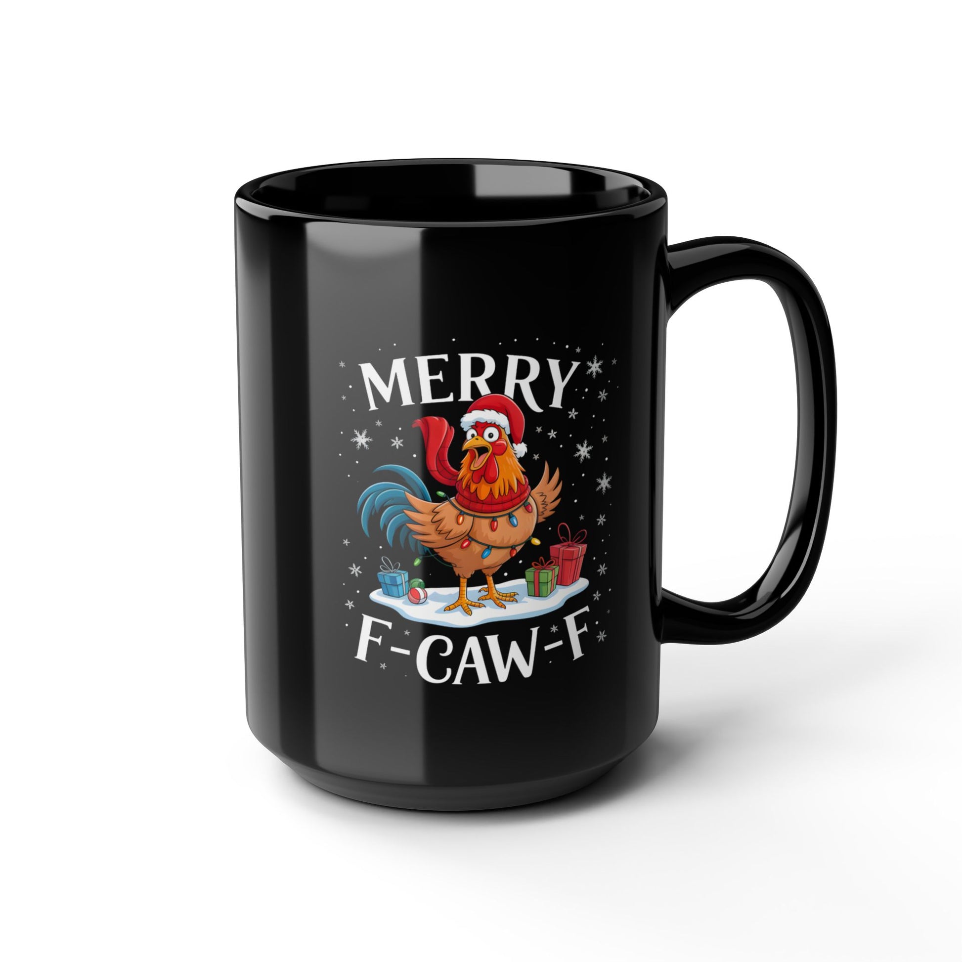 Merry F-Caw-F Rooster Christmas Mug — Funny Holiday Coffee Cup (11oz/15oz)