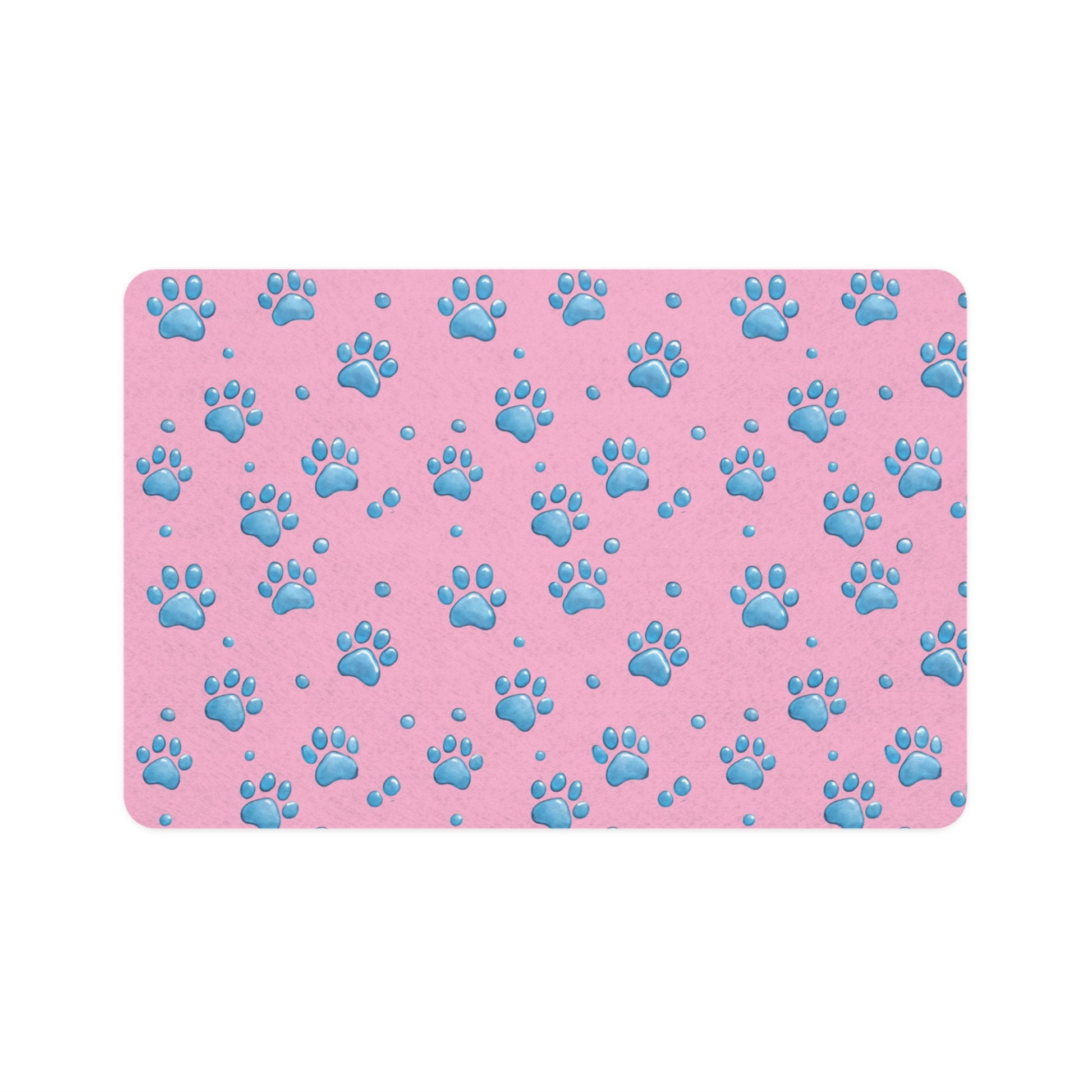 A cheerful pet food mat that brings a playful pop of color to your pet’s feeding corner. Soft yet durable polyester on the top shows off a bright pattern of sky-blue paw prints on a warm pink background. The neoprene rubber backing holds the mat steady on tile or hardwood so bowls stay put and spills are contained. Lightweight and quick-drying, it wipes clean or air-dries fast after a rinse. Use it to brighten mealtime, protect floors, and add a little personality to daily routines.